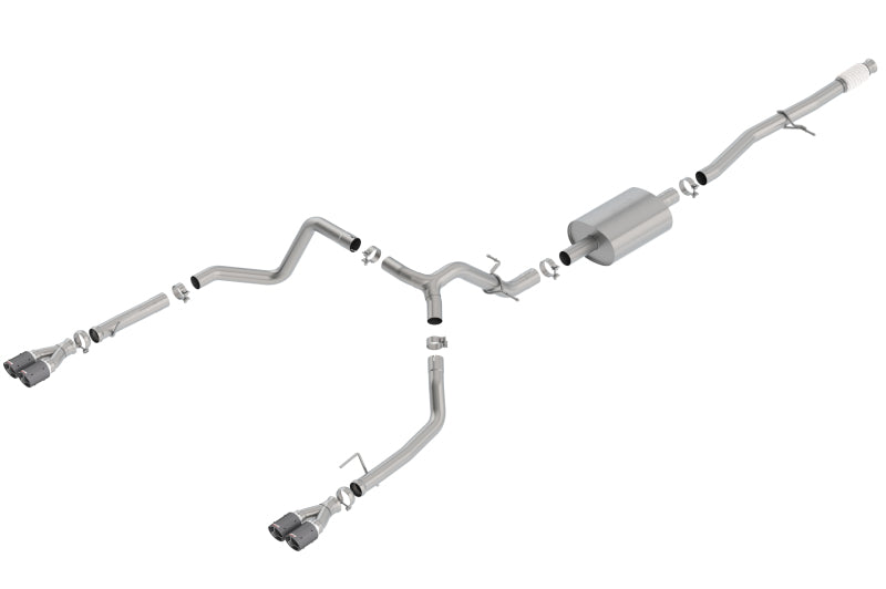 Factory Split Rear Exit vehicles. ONLY. This system features unique BORLA(r) 3.5" carbon fiber tips with bright centers. Black chrome on T-304 stainless steel tips are also available. Add Adapter 60708 for Crew Cab with Standard Bed (6' 7") 157" Wheelbase vehicles. BORLA(r) Cat-Back(tm) & Axle-Back exhaust systems feature patented straight-through and multi-core technology designed to unleash hidden horsepower. Increased exhaust velocity adds power, driving excitement, fuel economy, and the distinctive BORLA(r) Sound of Power respected by motoring enthusiasts everywhere. Each system is built from premium T-304 stainless steel, superior to T-400 series knockoffs (such as 409), to give you the absolute best in performance and durability. Ultra-smooth mandrel bends ensure maximum flow & power, and precision computer numerical control (CNC) manufacturing ensures an accurate fit. Best of all, BORLA(r) stands behind every system with a Million-Mile Warranty. Just what you'd expect from the world's most experienced (and most winning) exhaust brand.